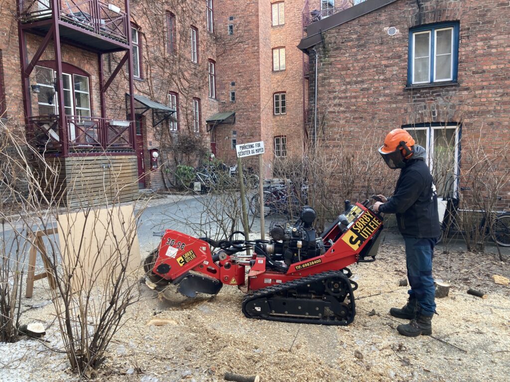 Etter at vi har felt treet deres, kan vi også tilby fresing av stubben. Da kan du utnytte plassen med noe vakkert å se på, istedenfor en gammel råtten stubbe.